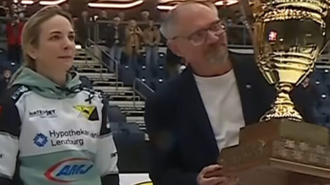 Earl Funk took to the ice after the game where he was presented with the trophy by Silvana Tirinzoni, who came all the way from Switzerland to bestow this honour.