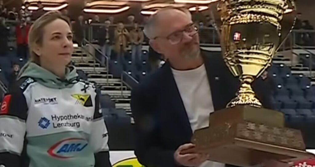 Earl Funk took to the ice after the game where he was presented with the trophy by Silvana Tirinzoni, who came all the way from Switzerland to bestow this honour.